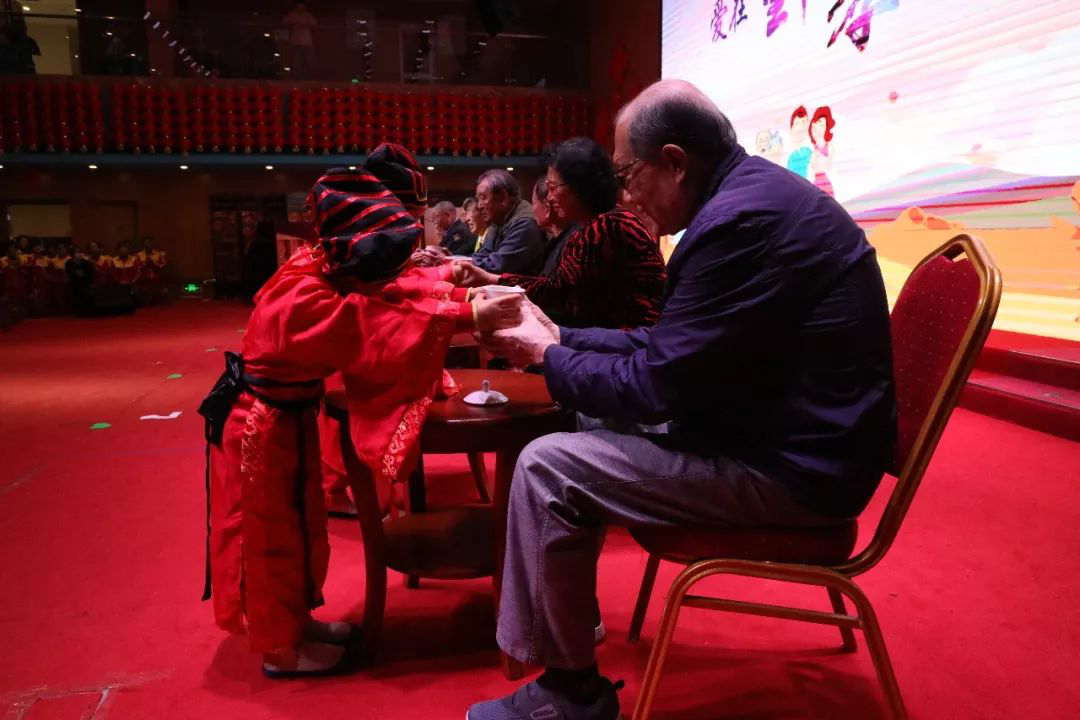 由骄点时尚幼儿园的小朋友与燕达养老的宾客代表共同带来的《感恩礼》仪式将演出推上了高潮。身穿汉服的小朋友为9位长辈敬茶、捶背;在老师的带领下朗诵敬老宣言;对所有在场的长辈们施传统孝礼。孩子们稚嫩的身姿、大声的诵辞和五体投地的孝礼让在场的每一位老年宾客无不动容,包括每一位在场的工作人员都眼含泪花,感动满满。孝义的精髓是传承,是敬老和育幼。孩子们的举动让我们感受到了中华民族孝义美德薪火相传的力量,弘扬了敬老孝亲的民族精神。