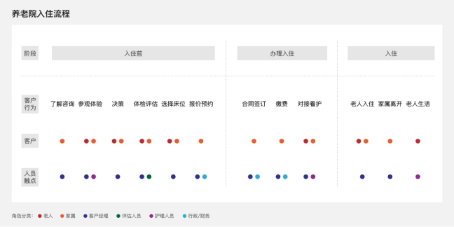 其中,服务人员的态度是否热情友善,对于整体体验有着关键性的影响。在任何服务之中,人都是作为关键触点存在,在养老院这一场景中更是如此。入住流程中接触到的人员类型大致分为: