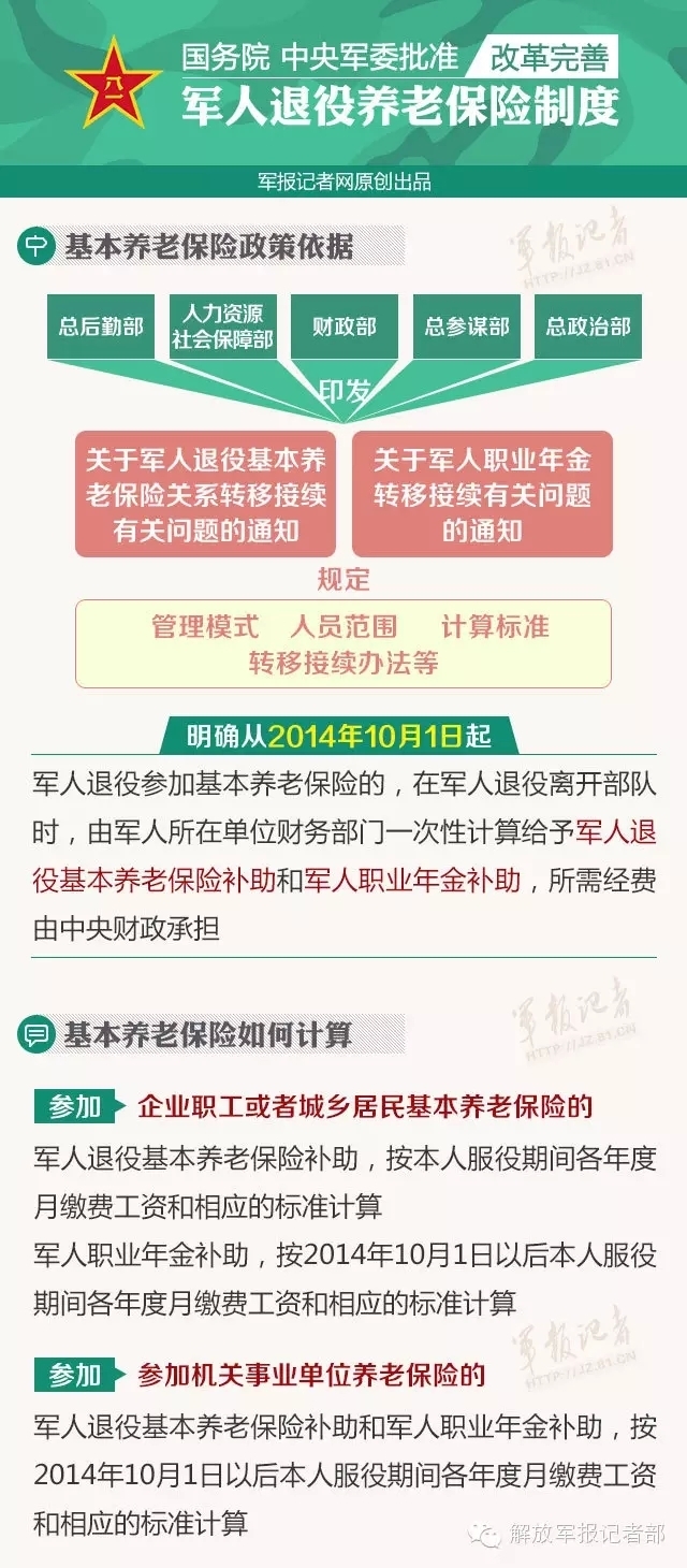 近日,国务院、中央军委批准改革完善军人退役养老保险制度。明确从2014年10月1日起,军人退役参加基本养老保险的,在军人退役离开部队时,由军人所在单位财务部门一次性计算给予军人退役基本养老保险补助和军人职业年金补助,所需经费由中央财政承担。据总后勤部财务部门负责人介绍,这次改革完善军人退役养老保险制度,坚持以国家大政方针为依据,紧密结合军队实际,在项目设置、人员范围、补助标准和实施时间等方面,与国家养老保险制度改革的指导思想、基本原则和主要政策保持一致,促进了军地保险政策有效衔接。