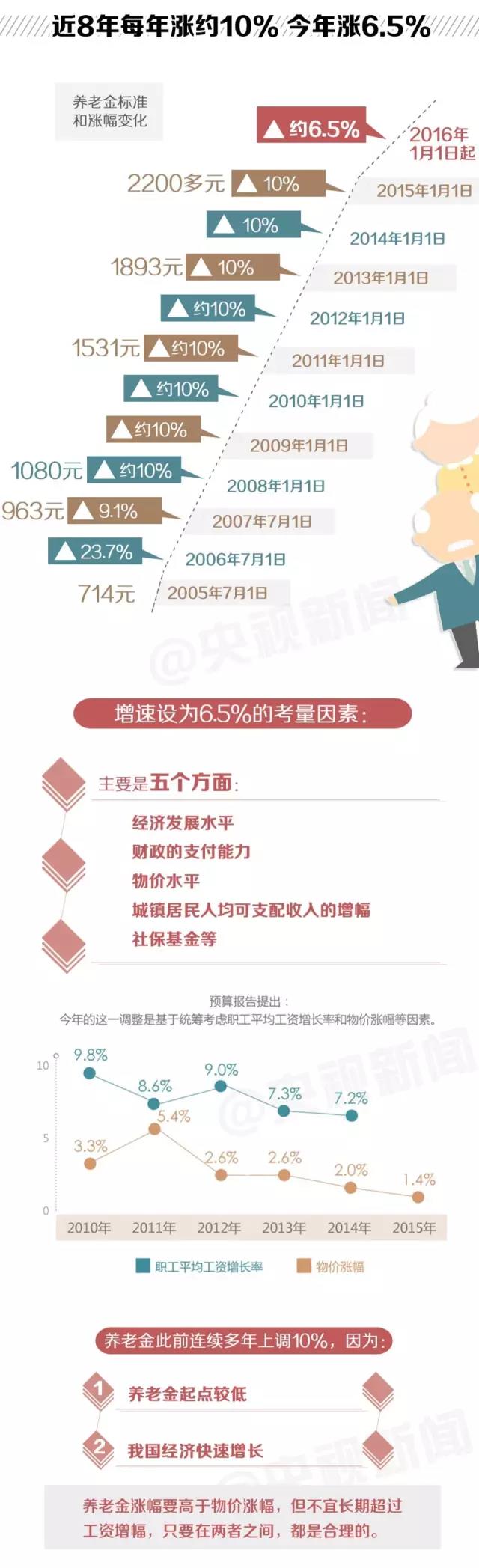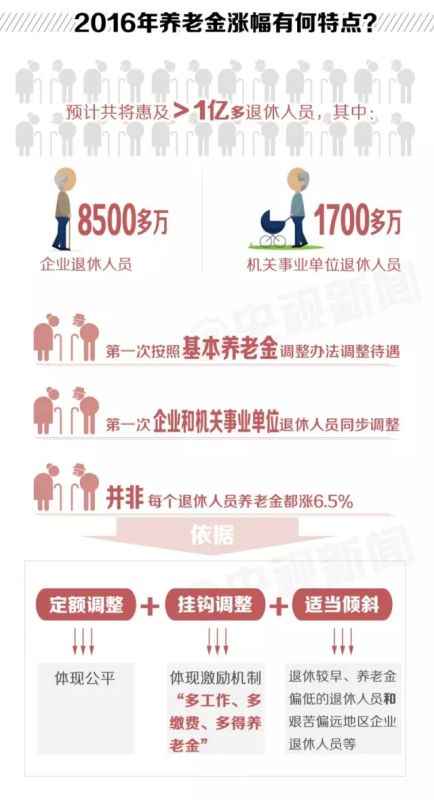 今年3月,李克强总理在政府工作报告中宣布企业退休人员养老金上涨6.5%。4月初,人社部、财政部印发了《关于2016年调整退休人员基本养老金的通知》。