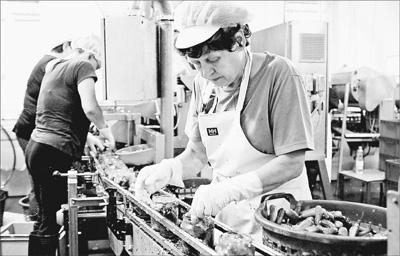 在德国,很多老人退休后依然在工作。图为勃兰登堡州一家酸黄瓜腌制厂的老年女工在工作。
