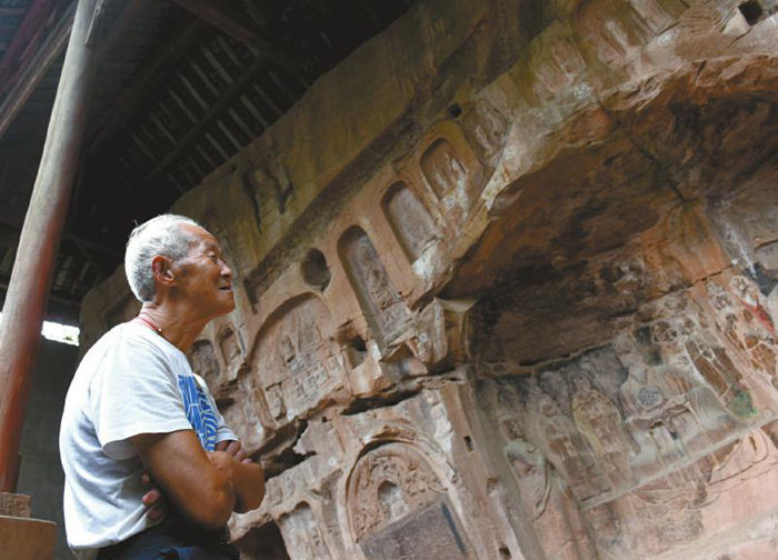 9月11日,成都龙泉驿区山泉镇,肖太发老人端详着岩石上的碑刻,仿佛面对一个老朋友。