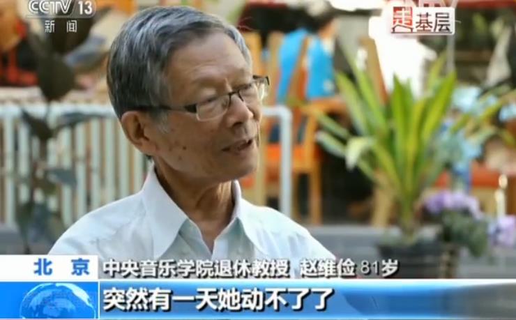 中央音乐学院教授 赵维俭 81岁:原来她就是膝关节不太好。每天我会搀她下来走一走啊,上楼比较困难一点。突然有一天她动不了了。所以后来在养老院,这里大夫挺好的,每天给她上药,换药,后来就好了。这是不是家 ,胜似家。