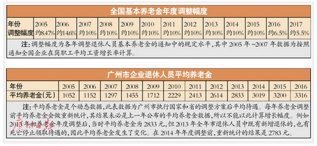 按照国家和省的部署,广州市企业退休人员养老金水平也逐年提高,平均养老金水平由2005年的1052元提高到2016年的3316元。记者了解到,广州自1998年以来每年都调高养老金水平,以往按一定比例调整,2006年起按照国家和省的规定,从定比调整改为定额调整,后按照国家和省的规定,采取定比和定额相结合的办法。