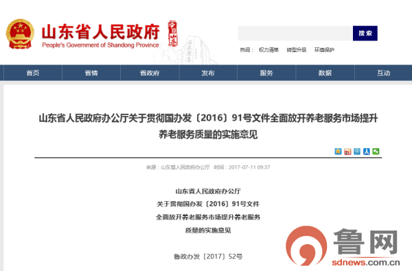 近日,记者从山东省人民政府官方网站获悉,为全面贯彻落实《国务院办公厅关于全面放开养老服务市场提升养老服务质量的若干意见》(国办发〔2016〕91号),实现到2020年全面放开养老服务市场的目标,进一步加快推进全省养老服务业发展,山东省人民政府办公厅发布《山东省人民政府办公厅关于贯彻国办发〔2016〕91号文件全面放开养老服务市场提升养老服务质量的实施意见》(下称《意见》)。