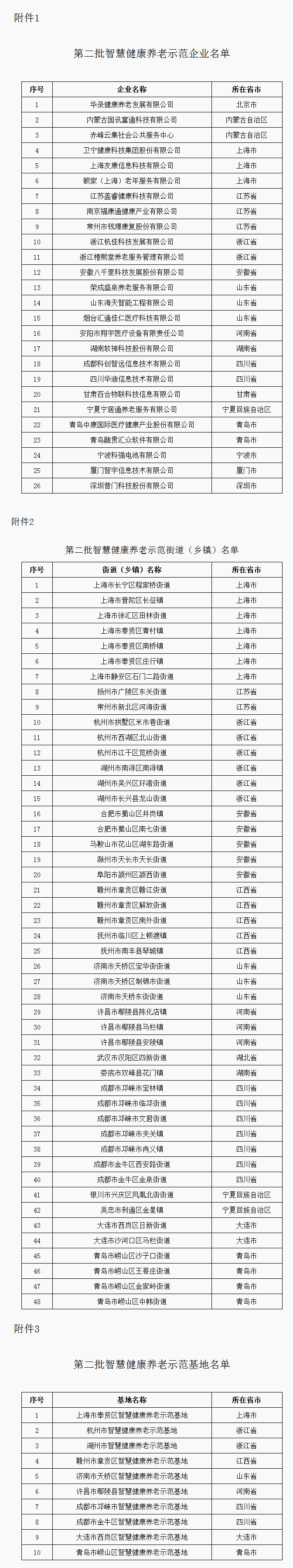 据工信部网站消息,根据《工业和信息化部办公厅 民政部办公厅 国家卫生健康委员会办公厅关于开展第二批智慧健康养老应用试点示范的通知》,经各地方主管部门推荐、专家评审和网上公示,确定了第二批智慧健康养老应用试点示范名单。
