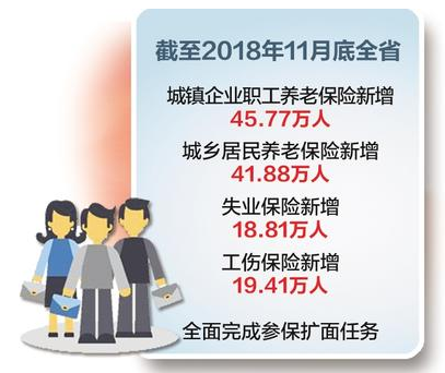 从省人社厅获悉,2018年以来,我省持续深化社会保障制度改革,民生安全网进一步织密扎牢。截至2018年11月底,全省城镇企业职工养老保险、城乡居民养老保险、失业保险、工伤保险人数分别新增45.77万人、41.88万人、18.81万人、19.41万人,全面完成参保扩面任务。