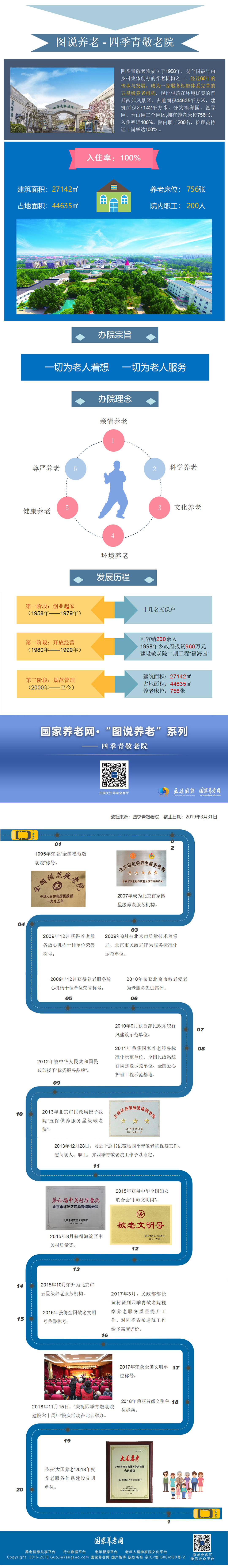 四季青敬老院成立于1958年,建院之初名为“幸福院”,供养本地孤寡老人,是新中国建立最早的养老机构之一,全国首家由乡村集体创办的敬老院。现址坐落在西山脚下、永定河畔、环境优美的首都西郊风景区,占地面积44635平方米,建筑面积27142平方米,分为福海园、義霖园、寿山园三个园区,拥有养老床位756张,入住老人平均年龄81.3岁。院内职工200名,护理员持证上岗率达100% 。