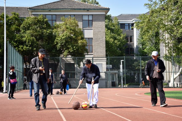 赶"猪"跑是个新赛项,在田径场20米长的跑道上用一木棍赶着一大一小的两只球,既要比速度又不能把球赶出跑道,的确有些难度。可是,老运动员们沉着应对,心、眼、手勠力协同,将不听话的两只“猪”小心翼翼、开开心心地赶着跑着十分有趣!