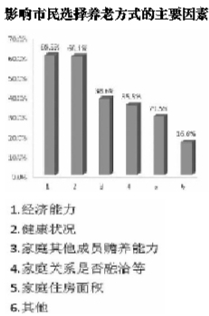 经济能力和健康状况是市民选择养老方式时考虑的最主要因素,选择比例分别是60.5%和60.1%。当然,其他家庭因素同样制约着养老方式的选择,比如家庭其他成员的赡养能力(38.6%)、家庭关系是否融洽(35.5%)、家庭住房面积(29.5%)等。