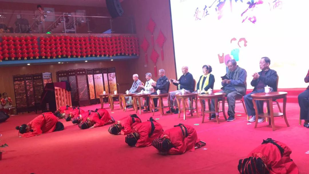 由骄点时尚幼儿园的小朋友与燕达养老的宾客代表共同带来的《感恩礼》仪式将演出推上了高潮。身穿汉服的小朋友为9位长辈敬茶、捶背;在老师的带领下朗诵敬老宣言;对所有在场的长辈们施传统孝礼。孩子们稚嫩的身姿、大声的诵辞和五体投地的孝礼让在场的每一位老年宾客无不动容,包括每一位在场的工作人员都眼含泪花,感动满满。孝义的精髓是传承,是敬老和育幼。孩子们的举动让我们感受到了中华民族孝义美德薪火相传的力量,弘扬了敬老孝亲的民族精神。