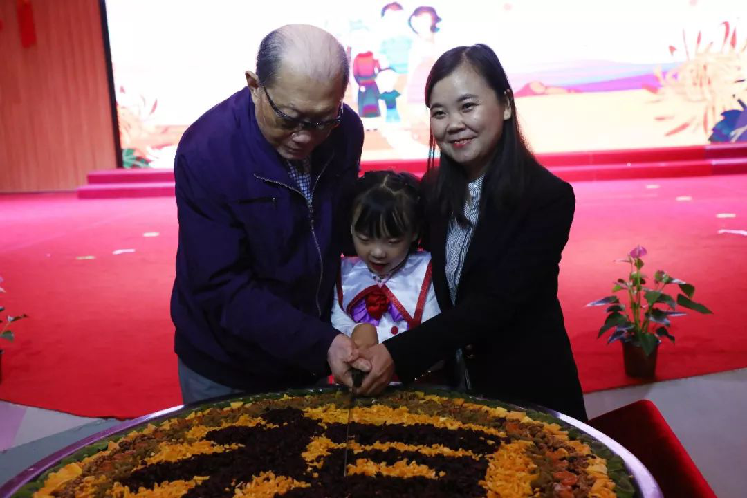 李海燕女士与宾客代表卫东爷爷一起分切重阳糕