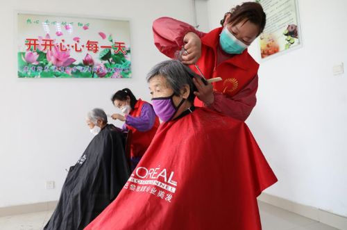 3月4日,在山东省博兴县博昌街道伏栾村老年公寓,“新时代文明实践志愿者”在为老人免费理发。(光明日报全媒体记者 赵秋丽 李志臣通讯员 陈彬)