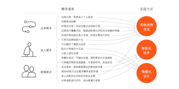 从上图可以看出,为老人创造更好的体验,养老院除了做好基本的护理工作外,要尽可能地帮助他们维系与家人、朋友之间的关系,给他们创造更多的活动条件。同时,让他们能够对一些事情做出决策,拥有更多自主选择的机会,也可以给他们带来更多心理慰藉。当然,实际的养老服务不会如此简单。综合老人、家属,养老院的视角来思考,能够对各方需求进行多元且细致的划分,并以此总结考虑具体的实现方式: