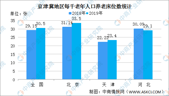 2019年北京每千老年人口养老床位数最多达33.5张,河北、天津每千老年人口养老床位数分别为29.1张、23.4张,低于全国平均水平。与上年相比,北京、天津每千老年人口养老床位数分别增加2.4张,1.2张。河北每千老年人口养老床位有所减少。