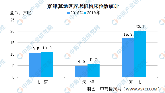 近几年,京津冀地区大力发展养老产业,养老床位增加。2019年全国共有注册登记的养老机构34369个,比上年增长19.9%,床位438.8万张,比上年增长15.7%。京津冀地区养老机构床位数36.7万张,比上年增加4.4万张。河北养老机构床位最多达20.1万张,比上年增加3.2万张。北京养老机构床位10.9万张,比上年增加0.4万张。天津养老机构床位最少为5.7万张,比上年增加0.8万张。
