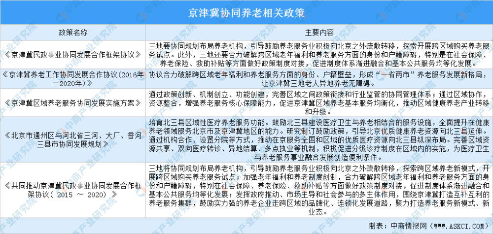 《京津冀民政事业协同发展合作框架协议》《京津冀养老工作协同发展合作协议(2016年—2020年)》《京津冀区域养老服务协同发展实施方案》等相关规划和政策出台,统筹建设特色养老服务片区,重点加强由基本养老功能衍生出的养老产业协同和相互输出,引导京津社会资本向河北养老服务领域流动,并设立京津冀养老服务协同发展试点机构,按照“养老扶持政策跟着户籍老人走”原则,逐步实现三地老人异地养老无障碍。