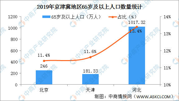 近年来,京津冀地区存在老龄化不断加深的问题。2019年北京65周岁及以上人口246.0万人,占总人口的比重为11.4%,上升0.2个百分点。天津65周岁及以上人口181.33万人,占总人口的比重为11.6%,上升0.7个百分点。河北65周岁及以上人口1017.32万人,占总人口的比重为13.40%,上升0.63个百分点。