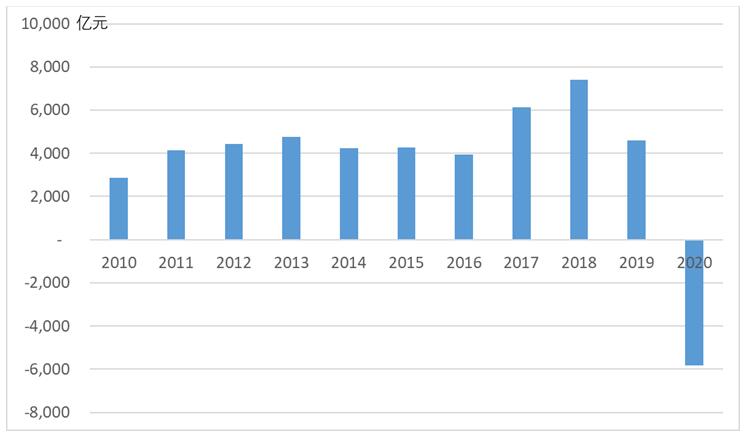 数据来源:人力资源社会保障部(2010-2012年数据只包含城镇基本养老保险收支余额,2013-2020年数据包含城镇基本养老保险和城乡居民社会养老保险余额之和)