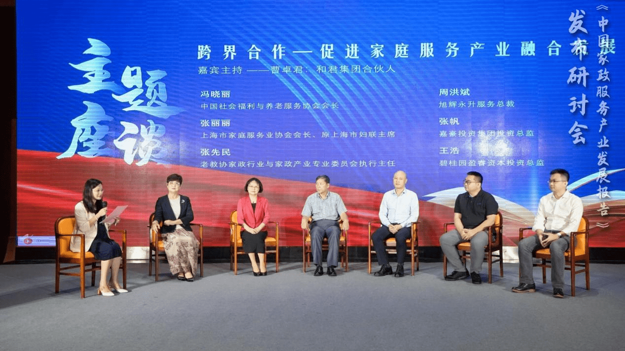 在和君集团合伙人曹卓君的主持下,中国社会福利与养老服务协会会长冯晓丽、中国家庭服务业协会副会长张丽丽、老教授协会家政专委会执行主任张先民、旭辉永升服务总裁周洪斌、嘉豪集团投资总监张帆、碧桂园盈睿资本投资总监王浩六位嘉宾以“跨界合作——促进家庭服务产业融合发展”为议题展开了一场别开生面的座谈讨论,从养老协会、家庭服务业协会、物业、投资人等不同角度探讨了家政服业与其他行业的融合发展,就家政服务与养老服务的联动发展、物业管理与家政服务的融合发展等碰撞出了新思路,引发了新思考。