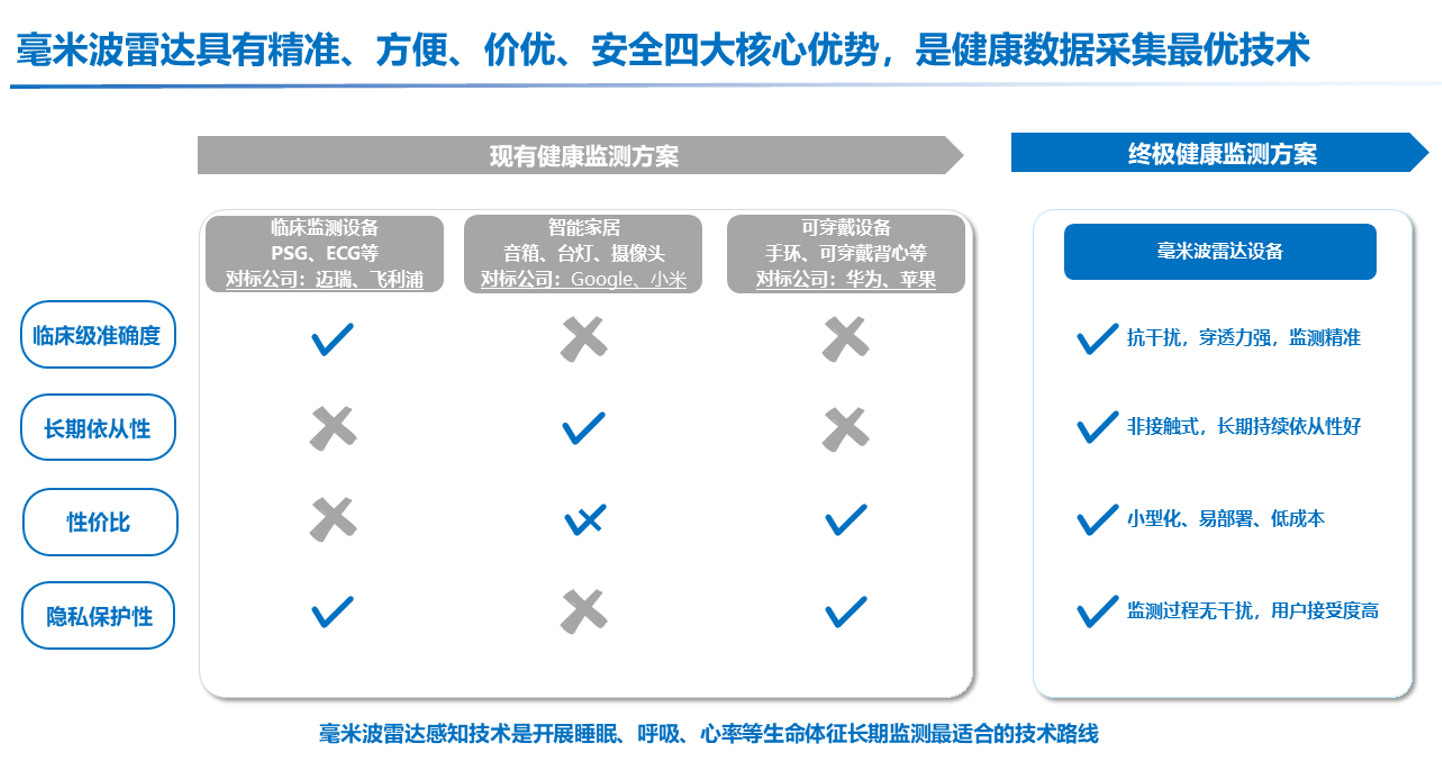 针对当前国内康养领域大量未被满足的需求空白,丁玉国表示:“毫米波雷达感知技术是开展睡眠、呼吸、心率等生命体征长期监测最合适的技术路线。”毫米波雷达设备具有精准、方便、价优、安全四大核心优势。