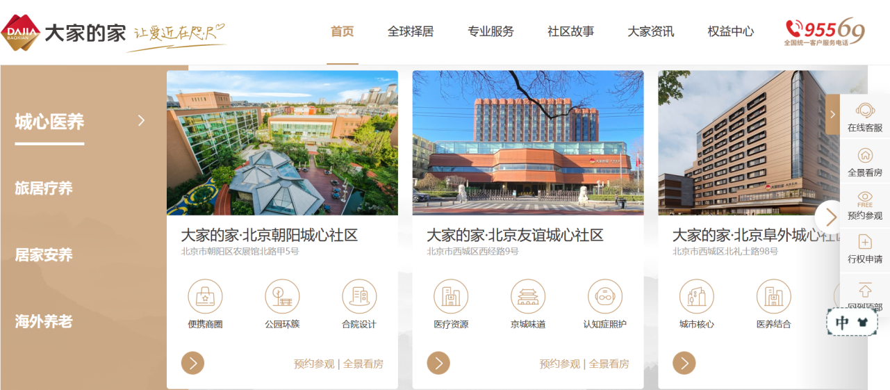 作为大家保险集团倾力打造的专业养老品牌,大家的家关注公众对美好生活、品质养老的向往,致力于满足不同家庭、不同人生阶段的多样化需求,从中国长者需求出发,目前已在国内完成“城心医养”“旅居疗养”“居家安养”三条养老产品线布局,在北京东三环、北京南二环、北京西二环、南昌市核心老城区、天津市泰安道中心地带、成都市五丁桥片区落子6个高品质持续照护养老社区,在杭州、北戴河、三亚、黄山落地4个旅居项目,在北京外交部街33号院和新华社皇亭子家属院探索居家照护中心,为2000多名长者提供高品质养老服务。