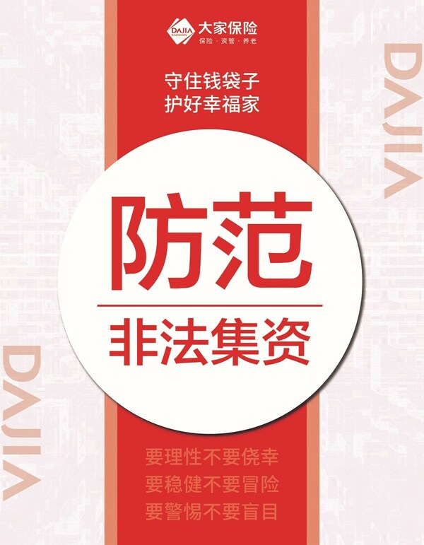 为贯彻落实国务院、国家金融监督管理总局关于做好防范和处置非法集资工作指示精神和有关要求,切实做好保险业防范非法集资宣传教育工作,提高社会公众对非法集资的识别能力和防范意识,6月1日起,大家保险集团全面开展主题为"守住钱袋子·护好幸福家"的防范非法集资宣传月活动,通过多种途径提升社会公众的金融素养和风险防范意识。
