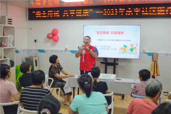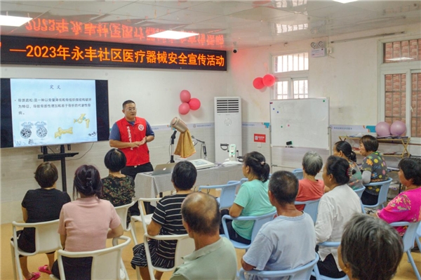为了提高社区居民对医疗器械安全的意识和重视程度,促进居民正确使用医疗器械,避免不当使用带来的风险,以及传播医疗器械安全知识,提升居民的医疗器械安全素养,7月14日,永丰社区党委举办“安全用械 共享健康”医疗器械安全宣传活动,创新打造永丰社区党建“三色环”品牌,发挥第三党支部绿色环“绿色、安全”作用。
