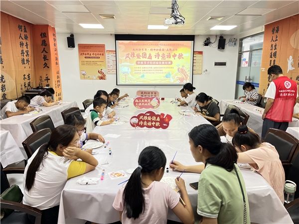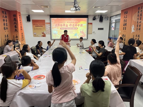 中秋手绘团扇环节,团扇是中国传统工艺品及艺术品,不仅寓意着古韵典雅、团圆如意、宽厚友善,更承载着执扇人的情思浓意。志愿者老师为青少年家庭分发团扇手工材料,在志愿者老师精细地指导和家长的密切配合下,青少年用五颜六色的颜料开启天马行空、不拘一格的创作过程,期间还不时地交流制作想法,整个活动现场充满着浓厚的创作热情和欢快的笑声,在青少年的精心绘制下,一柄柄富有中秋文化气息的古风团扇就制作出来,青少年看着自己的专属的古风团扇相互鉴赏、交流。青少年们激动地说道:“看!这是属于我的古风团扇”,兴奋地向志愿者老师和家长展示自己的作品,分享着自己的喜悦。