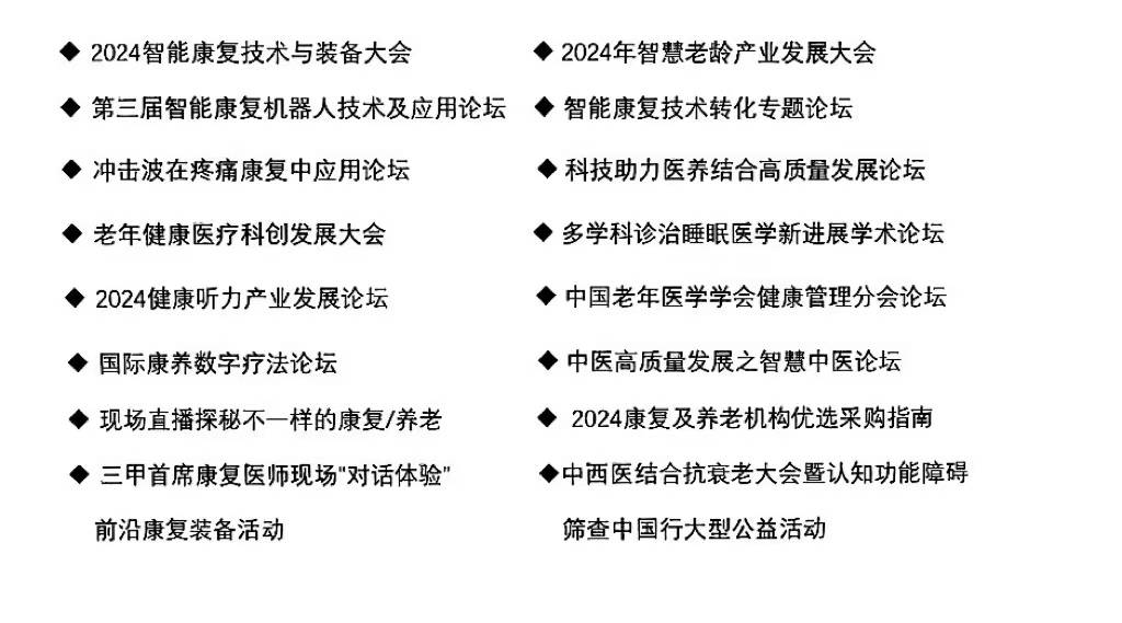 聚集产业难点热点趋势点、力促展览”与“会议”深度融合创新、搭建产学研用供需对接桥梁、赋能康养产业高质量发展一直是主办方办展初心。届时展会现场,主办方将拟邀中国康复医学会康复工程与产业促进专委会、中国老年医学学会健康管理分会、中国老年学和老年医学学会、中国康复技术转化及发展促进会、民政部培训中心-老年福祉学院、中国抗衰老促进会、北京康复医院、上海交大第九人民医院等权威学术机构及行业龙头代表,共同举办2024智能康复技术与装备大会、2024年智慧老龄产业发展大会等诸多学术论坛及活动。