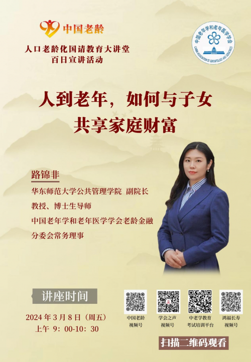 人口老龄化国情教育大讲堂百日宣讲活动3月8日上午9:00,走进工业和信息化部,开展“人到老年,如何与子女共享家庭财富”的专题讲座,线上同步直播,敬请期待!
