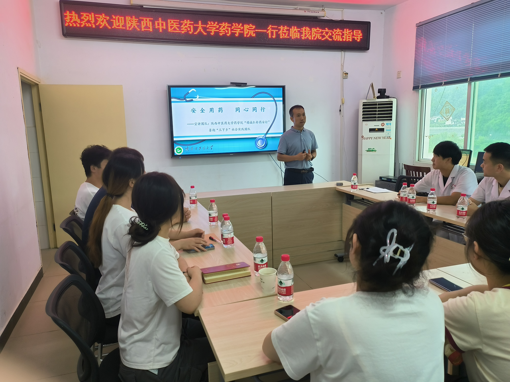 7月10日这天汉阴县持续降雨,可依然无法浇灭陕西中医药大学药学院社会实践师生团队到达汉阴县汉阳镇中心卫生院开展安全用药科普宣传的热情。在药学院党委副书记王薇的带领下,社会实践师生团队与卫生院的医务人员进行了一次深入的学习交流。药理学教研室的专职教师史永恒副教授以“安全用药,同心同行”为主题,带来了一场精彩的讲座。