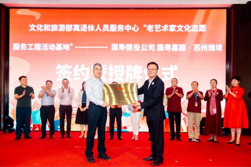 为了积极践行文化养老,共同构建长者的精神家园,2023 年,国寿健投公司与文旅部离退中心签订《养老服务合作协议》,旗下国寿嘉园 · 苏州雅境养老社区被授予文旅部 " 老艺术家文化志愿服务工程活动基地 " 荣誉称号,双方共同探索如何更好地满足长者精神文化需求。