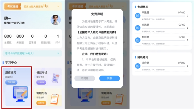 凯禾瑞华开发的老年人能力评估学习小程序,为参赛学员构建了一个高效、便捷的学习环境。老年人能力评估学习小程序包含题库练习、模拟考试、自动组卷、答题进度追踪、错题收藏、答题标记等功能。老年人能力评估学习小程序严格遵循竞赛标准,使学员能够不受时间和空间的限制,随时随地学习,为考生们取得优异成绩奠定了坚实基础。