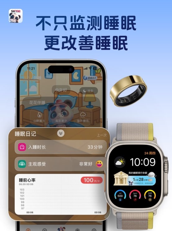 天悦康康不做数据的搬运工,而是将CBT-I的精髓融入产品设计。其自主研发的康康AI智能健康指环,作为国内智能戒指领域的领先者,对标的是芬兰智能戒指独角兽Oura Ring,是不输国际标杆的卓越之选。它以极致轻薄设计实现无感穿戴,厚度2mm+,重量2-3克,能监测夜间完整的睡眠周期,甚至连15分钟的午睡小憩都能记录。这不仅确保全天候睡眠数据完整性,而且综合多维度的睡眠指标生成“睡眠分数”,为精准干预的改善睡眠方案提供了数据支撑。