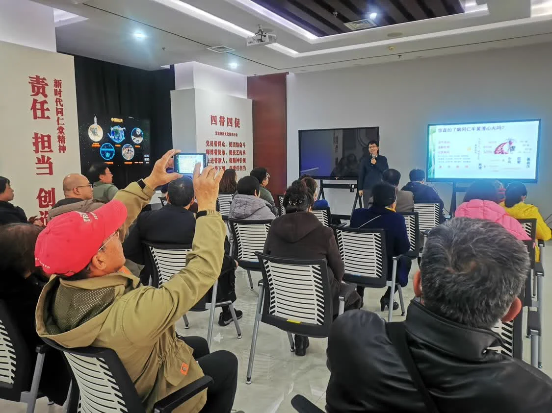 项目在北京同仁堂大兴基地为职工及其家属们带来了一场专业而温暖的健康服务体验。作为项目的协办方,北京同仁堂自今年4月以来,持续为银铃一族的健康保驾护航。此次活动更是派出专家团队,全程服务于职工及家庭。北京同仁堂专家为前来咨询的职工及家属提供一对一的义诊和用药指导,不仅认真解答他们在日常保健中遇到的困惑,给出诊疗建议,还讲解了家中常备中成药的正确服用方法与注意事项。中国中医科学院专家则为职工家属讲解了秋冬季心脑血管养生知识。活动现场还特别设置了清心健脑活络操重点穴位讲解环节。“轻拍百会能醒脑开窍,揉压心俞可宁心安神…”,在职工与家属们的认真跟练中,中医药智慧也走进了他们的日常生活。