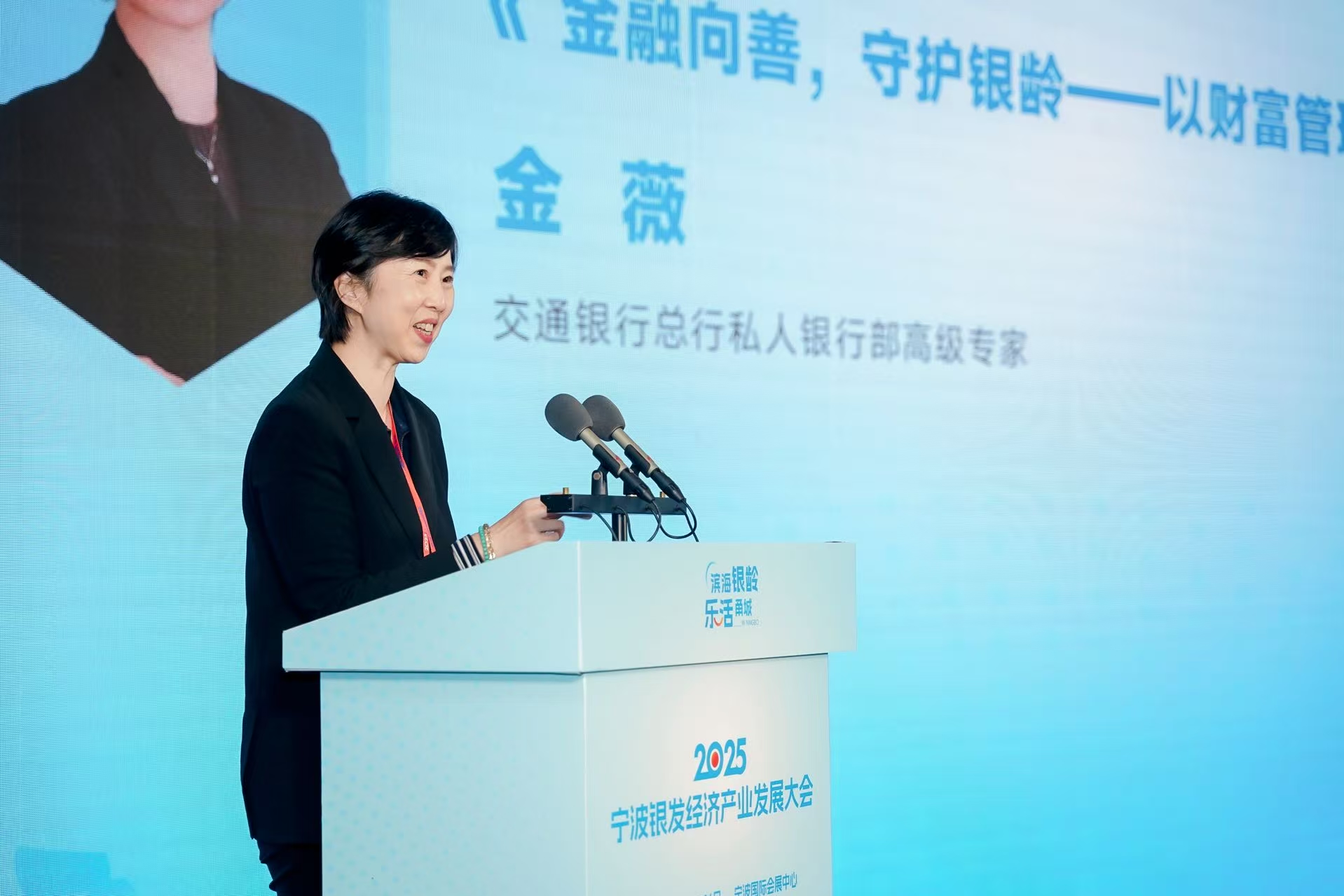 在同期举办的“甬抱银龄·财赋未来”主题论坛上,交通银行总行私人银行部高级专家金薇进行了以“金融向善守护银龄”为主题的分享,重点介绍了交行养老金融的创新路径与实践成果。她指出,交行聚焦客户养老配置、传承与服务等核心需求,通过稳健资产配置、多元传承工具及完善服务生态,构建全生命周期养老金融新范式,引发与会嘉宾共鸣。